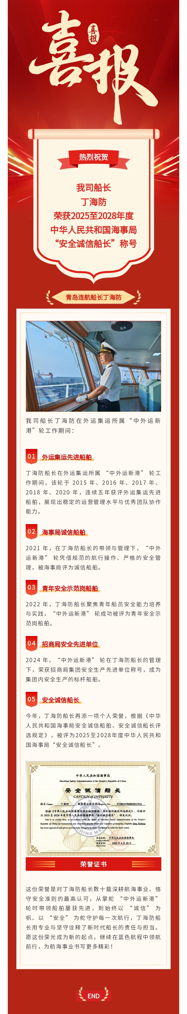 我司船長丁海防榮獲“安全誠信船長”稱號